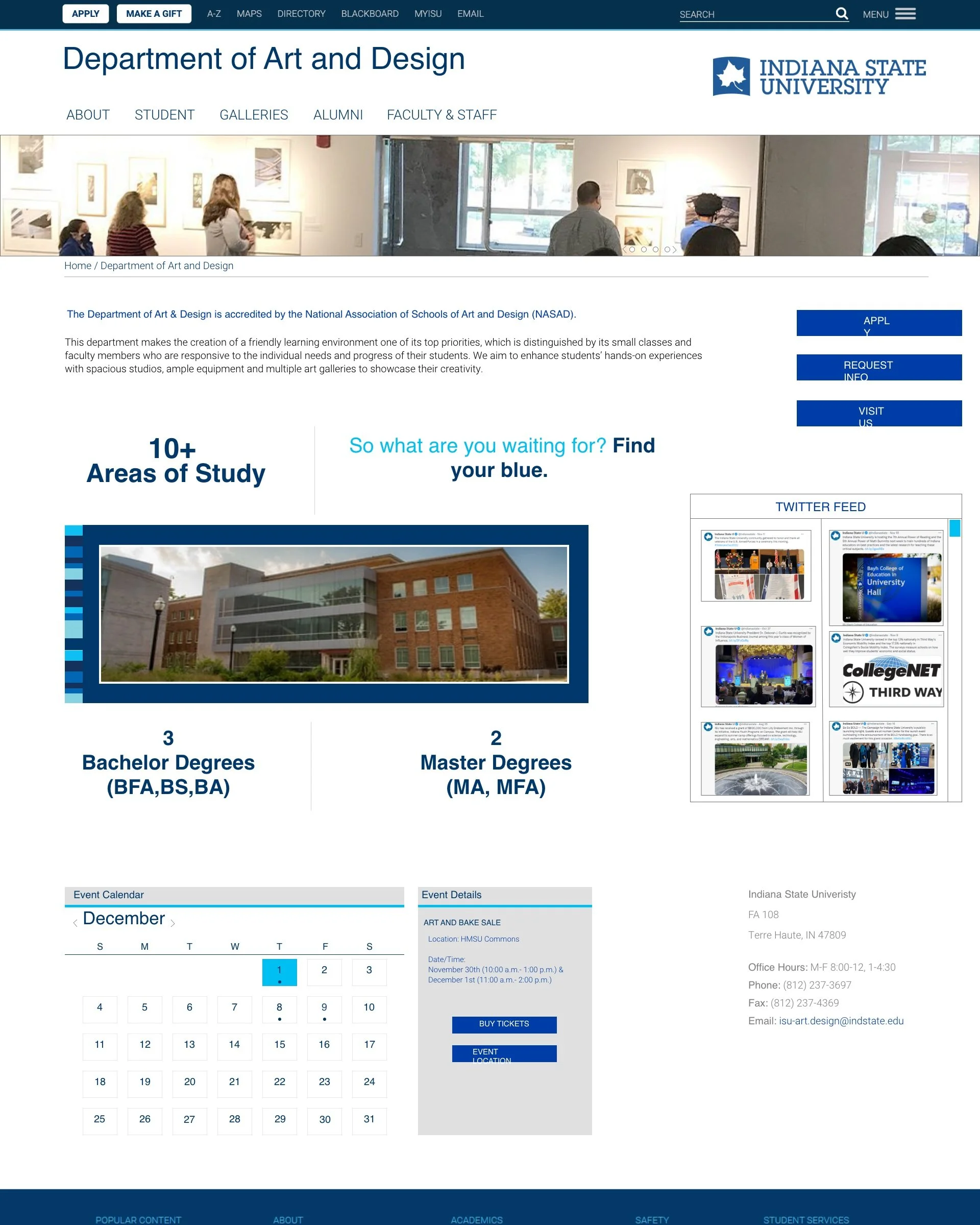 The College of Art and Design Website needed a complete redesign with all the updated logos but also showing off our programs better. As a group of five people, we dissected the website on what worked and what did not. The goal was to find new ways to incorporate social media and display large amounts of text in the most effective ways.